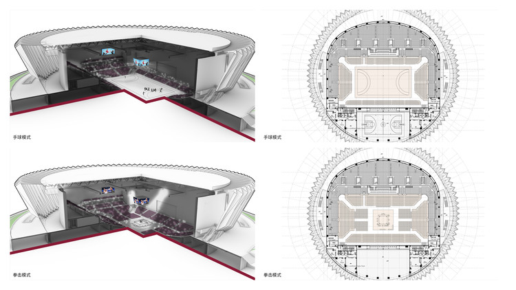 設(shè)計(jì)功能時(shí),比賽館與訓(xùn)練館并列布置,比賽館內(nèi)固定的看臺(tái)采用 U型三面布置,活動(dòng)看臺(tái)圍合競(jìng)賽場(chǎng)地四面布置。活動(dòng)分隔賽與訓(xùn)練館之間。賽會(huì)館、訓(xùn)練館分別承擔(dān)比賽和準(zhǔn)備活動(dòng)。轉(zhuǎn)化成表演方式后,訓(xùn)練館可作為文藝表演功能的舞臺(tái)。